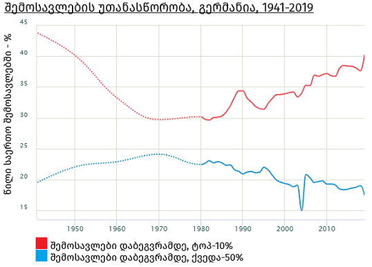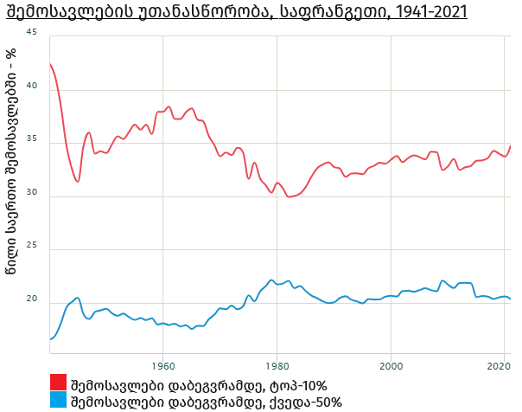 1940-1960-იან წლებში და 1970-იანი წლების შემდგომ პერიოდში შემოსავლების განაწილების განსხვავებული ტენდენციის დამადასტურებელია პარიზის ეკონომიკის სკოლის და ბერკლის უნივერსიტეტის ერთობლივი კვლევა, რომელსაც World Inequality LAB აწარმოებს ამ ორი უნივერსიტეტის მკვლევართა ერთობლივი ჯგუფის ჩართულობით. მრავალ სხვა დაკვირვებასთან ერთად ისინი სხვადასხვა ქვეყანაში ყველაზე მდიდარი 10%-ის და ღარიბი 50%-ის შემოსავლების ცვლილების ტენდენციებსაც იკვლევენ. აშშ-ის, გაერთიანებული სამეფოს, იტალიის, იაპონიის და გერმანიის მაგალითზე ნათლად ჩანს, რომ 1940-დან 1970 წლამდე ქვედა-50%-ის შემოსავლების წილის მზარდი, ხოლო ზედა-10%-ის წილის კლებადი ტენდენციაა. უფრო თანაბარი სურათია საფრანგეთში. შემოსავლების განაწილების მხრივ შერჩეულ ქვეყნებში მსგავსი ტენდენციაა, რომელიც 1970-იანი წლებიდან მზარდი უთანასწორობისკენ იხრება.